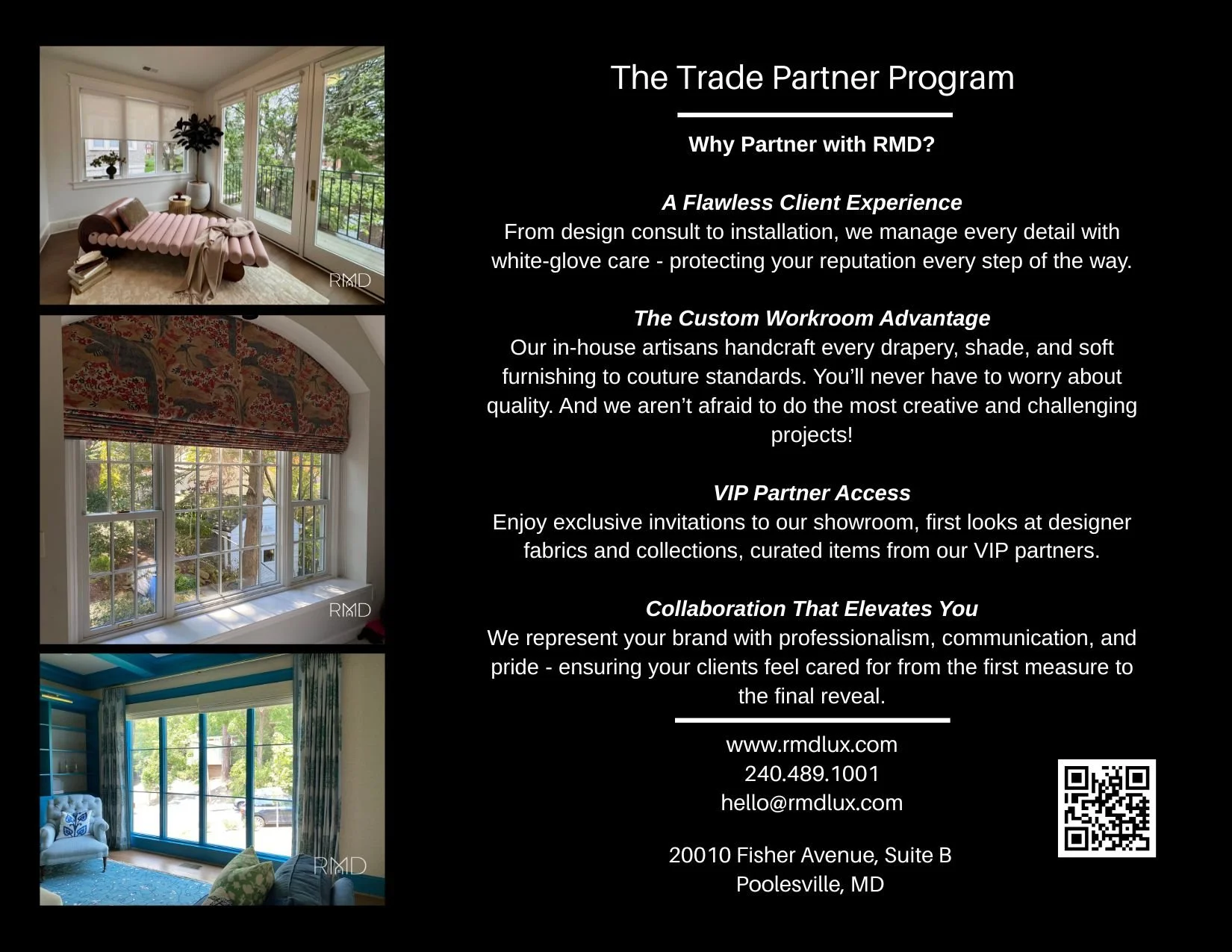 At RMD Luxury Window Treatments, we partner with interior designers, builders, architects, and real estate professionals who share our passion for craftsmanship, reliability, and exceptional client experiences.
